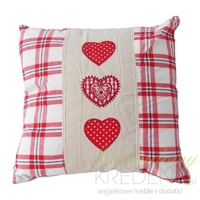 Poduszka prowansalska ozdobiona czerwonymi sercami i motywem kratki.
