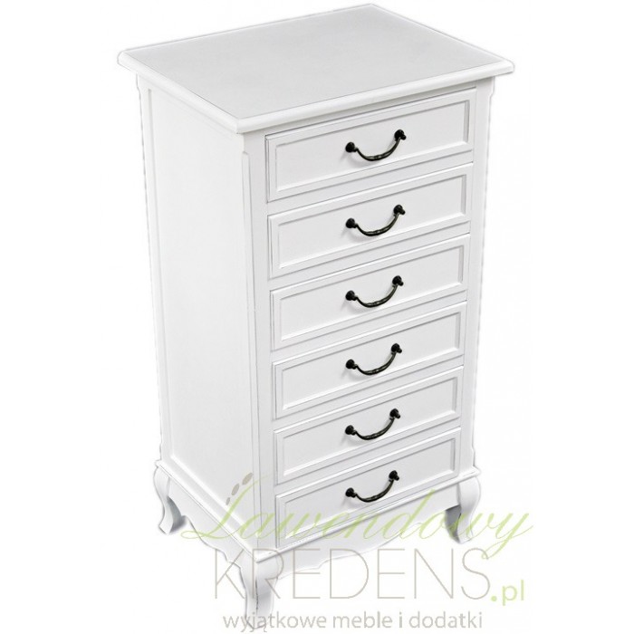 Komoda prowansalska Biała Prowansja wyposażona jest w sześć szuflad z klasycznymi uchwytami w czarnym kolorze. Stylowe nóżki komody sprawiają, że klasyczna biała komoda wygląda lekko i gustownie, jednak nie odejmuje jej to stabilności. Meble w stylu prowansalskim to świetny wybór ze względu na ich wyjątkową urodę, użyteczność oraz pojemność. Jeżeli chcesz mieć pewność, że Twój wymarzony mebel pomieści wystarczającą ilość przedmiotów to Biała Komoda Prowansja jest dla Ciebie!