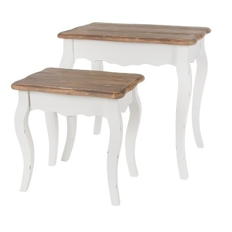 Dwa stoliki prowansalskie to modele wykonane w dwoch różnych rozmiarach, z drewna paulownia z brązowymi blatami.