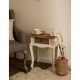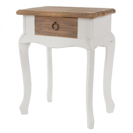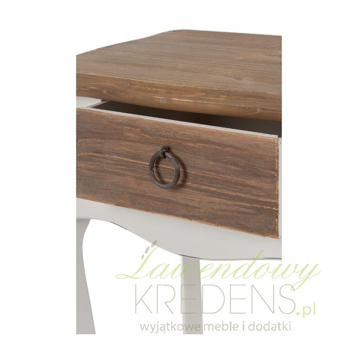 Stolik w stylu prowansalskim o standardowej wysokości 57 centymetrów ma brązowy blat i szufladkę.