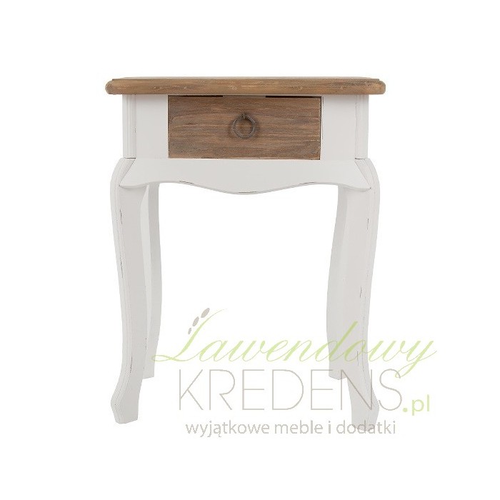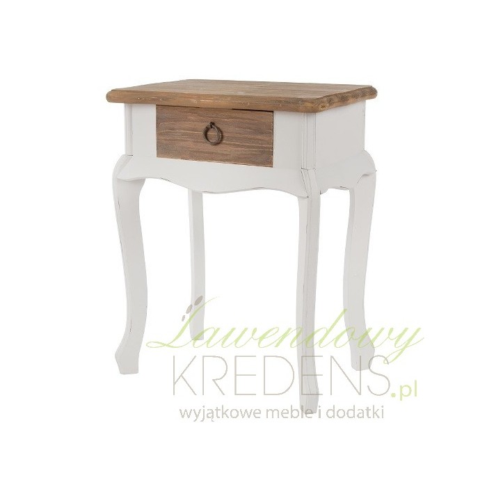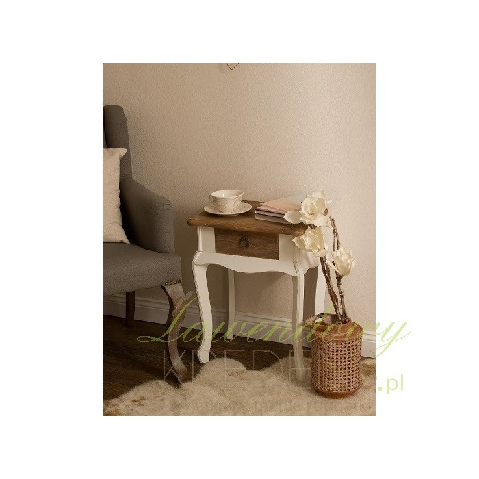 Stoliki nocne z kolekcji Prowansja to piękne połączenie kolorystyczne: brązowych blatów i szuflad z białymi nogami. Stolik w stylu prowansalskim to uroczy mebel z praktyczną szufladką wyposażoną w poręczny, okrągły uchwyt z metalu. Biało-brązowy stolik nocny został przetarty na nogach, dzięki czemu świetnie wpasuje się także do aranżacji rustykalnych. Zamów go już teraz!