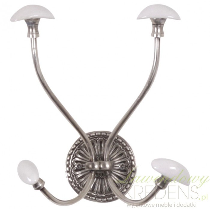 Wieszaki ścienne wspaniale zdobią ścianę i pełnią bardzo praktyczną funkcję. Metalowe wieszaki to trwała konstrukcja, która posłuży na długie lata. Metalowy wieszak ma srebrny kolor i ceramiczne, białe ozdobne gałki. Wieszak jest podwójny i ma jasny, uniwersalny kolor.