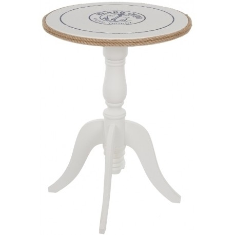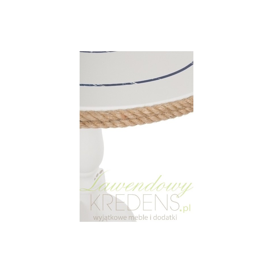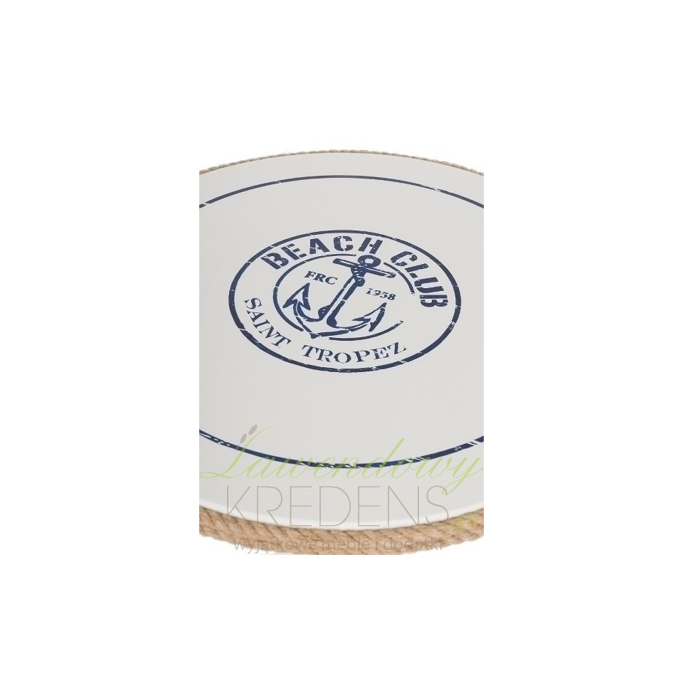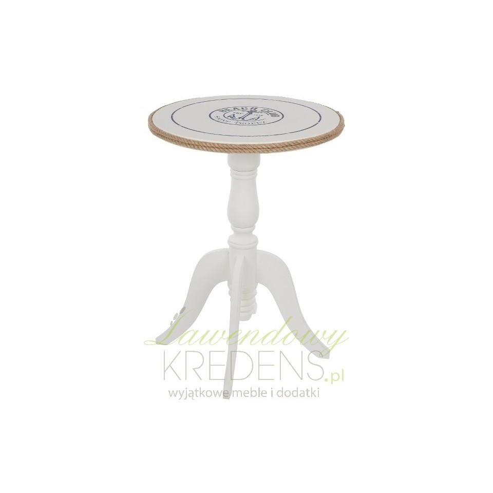 Meble w stylu marynistycznym bardzo często spotykane są w kurortach, ale coraz częściej widoczne są również w domowych aranżacjach. Stolik marynistyczny niemieckiej produkcji jest z drewna paulownia, w kolorze białym z niebieskimi detalami. Na jego okrągłym blacie występuje napis BEACH CLUB oraz motyw kotwicy. Stolik idelanie spełnia się w roli stolika kawowego.