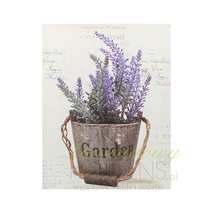 Obraz prowansalski przedstawiający lawendę w donicy na białym tle z subtelnymi, zanikającymi napisami. Obraz wykonany został na płótnie i naciągnięty na sosnową rame, dzieki czemu jest lekki w przenoszeniu i łatwy w zawieszeniu. Wzbudzający zainteresowanie obraz z lawendą stanowi znakomite uzupełnienie wystroju wnętrza. Dzięki niemu Twój salon, kuchnia sypialnia czy biuro zyskają osobliwy charakter.