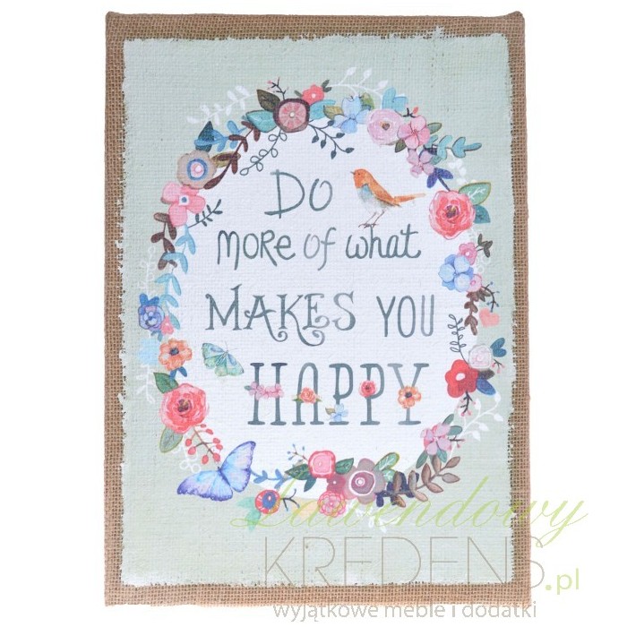 Prostokątne obrazy prowansalskie namalowane na jucie. Obrazy ozdobione są grafiką w bardzo uroczym stylu, w wieńcu kolorowych kwiatów znajduje się angieslki napis, mówiący aby w życiu robić rzeczy które czynią nas szczęśliwymi. Napis ten wygląda niczym zapisay piórem.