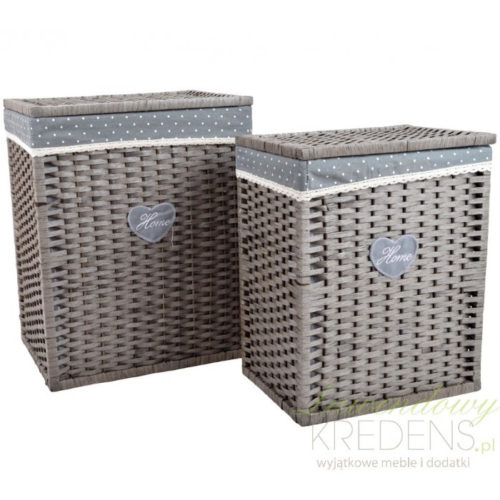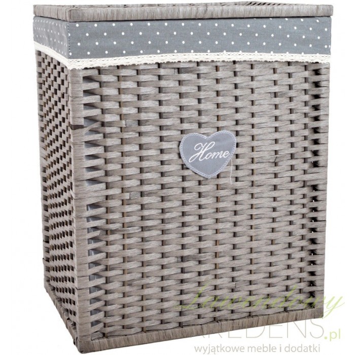 Estetycznie wykonany, gęsto pleciony wiklinowy kosz na bieliznę w prowansalskim stylu, dzięki któremu Twoja łazienka nabierze wdzięku i klasy. Szara powierzchnia kosza przełamana została materiałem zakończonym koronką i emblematem w kształcie serca z napisem Home. Atutem naszego kosza jest dopasowana pokrywa!