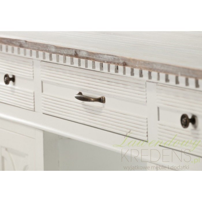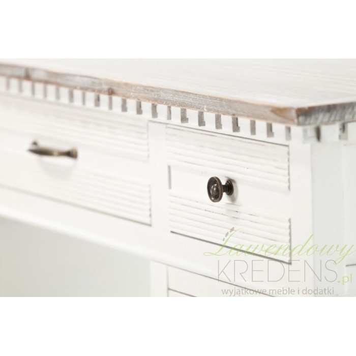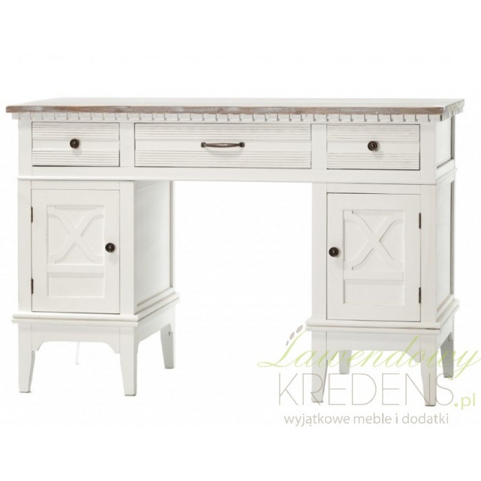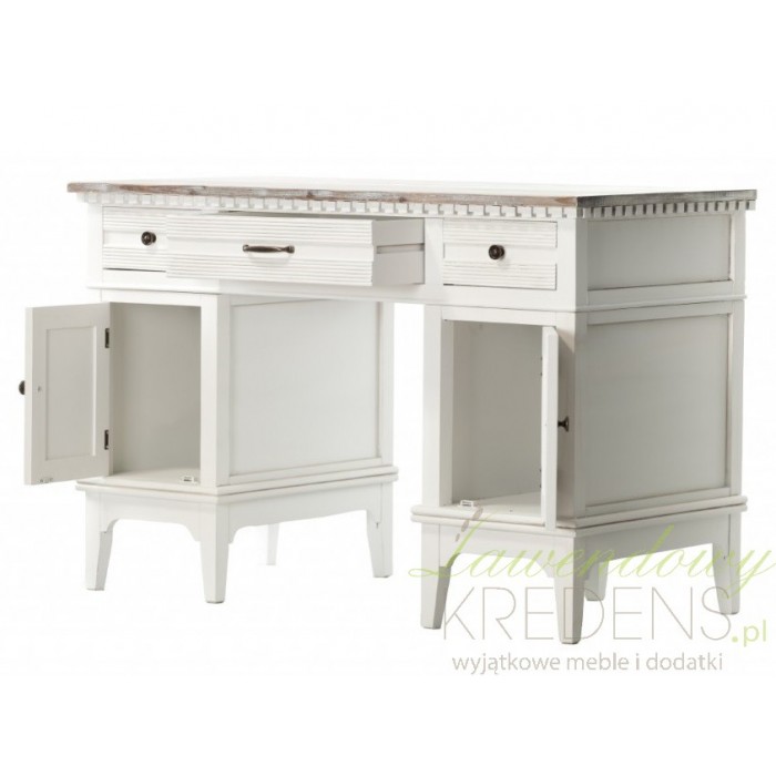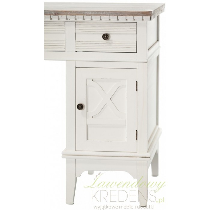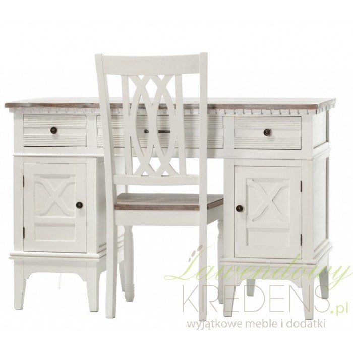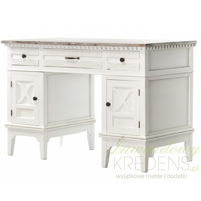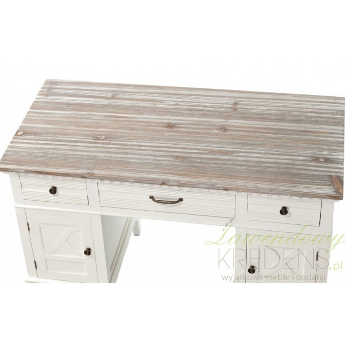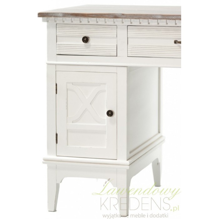 Biurko Palida Aluro w stylu prowansalskim to komfortowy mebel idealny do urządzenia domowego gabinetu i nie tylko. Zwróć uwagę na wspaniały, charakterystyczny blat, który wygląda niebywale naturalnie. Biurko prowansalskie jest wyposażone w dwie szafki i trzy szuflady z eleganckimi, czarnymi gałkami. Wyważone proporcje i konstrukcja mebla sprawiają, że nie tylko nienagannie się on prezentuje ale jest także bardzo wygodny w użytkowaniu.