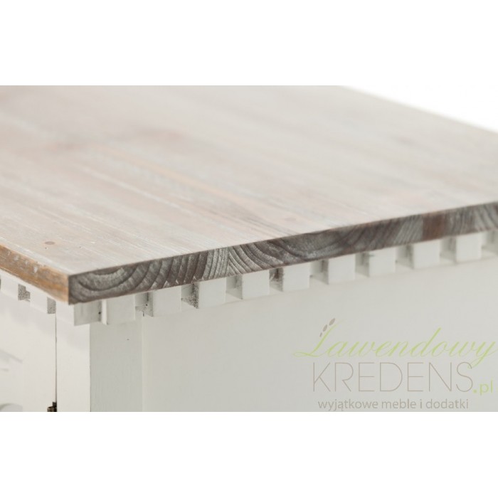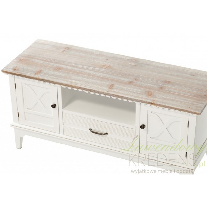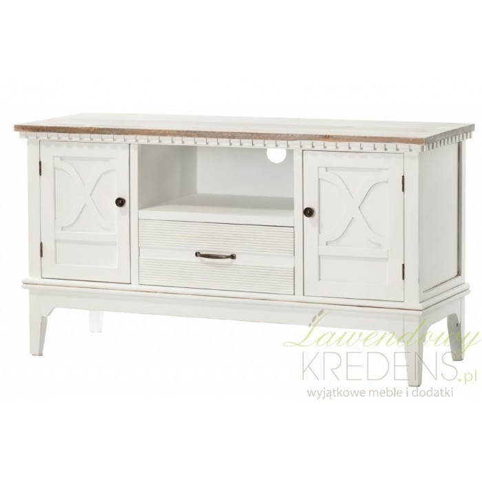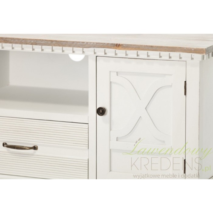 Komoda pod telewizor to mebel niezbędny w każdym wnętrzu, również w tym urządzanym na styl prowansalski. Piękna komoda rtv Aluro wykonana z drewna i mdf ma szeroki, bielony blat z widocznym usłojeniem. Mebel wyposażono w dwie szafki z dekoracyjnymi drzwiami i pojedynczą szufladkę. Znajdują się na nich ozdobniki w formie krzyżykow na drzwiach i ptaków na szufladzie. Meble Aluro to pewnik urządzenia oryginalnego salonu.