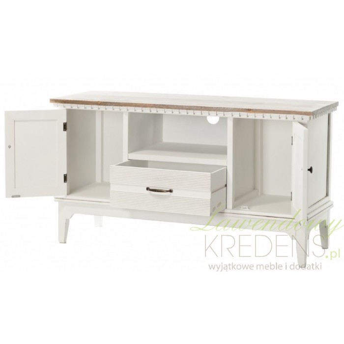 Biała komoda pod telewizor Aluro to mebel z kolekcji Palida, która charakteryzuje prowansalski design w funkcjonalnym wydaniu.
