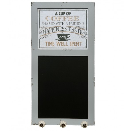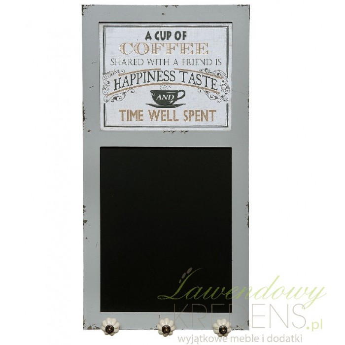 Prostokątna tablica do pisania ozdobiona została szarą ramą, która u dołu posiada trzy wieszaki w postaci ceramicznych kwiatków. Ta tablica retro posiada także postarzaną grafikę na której widoczna jest filiżanka oraz napisy.
