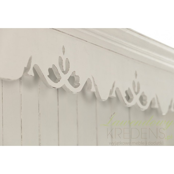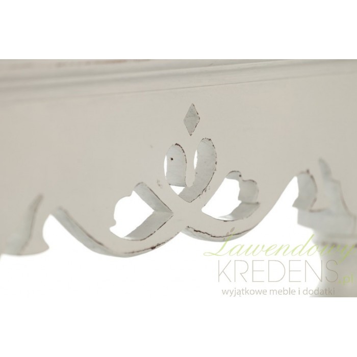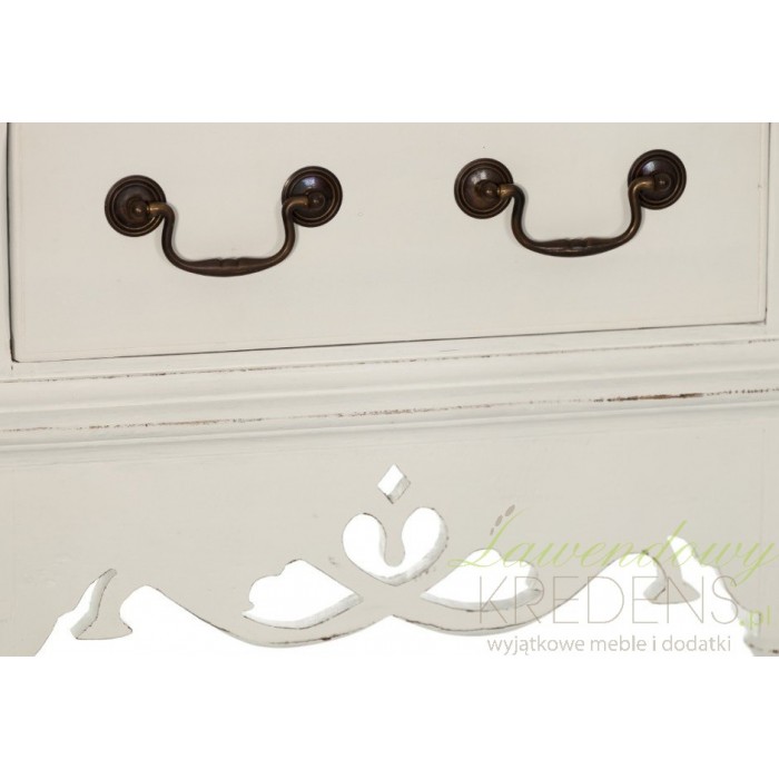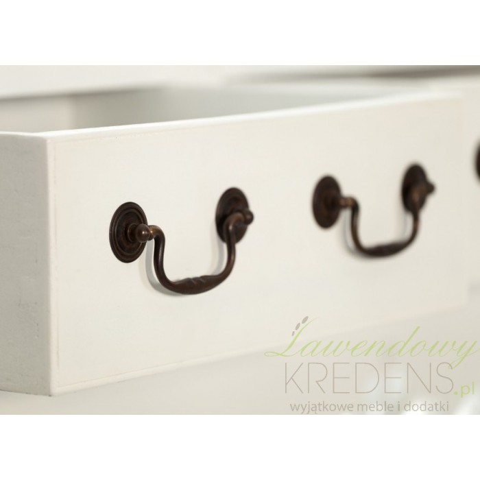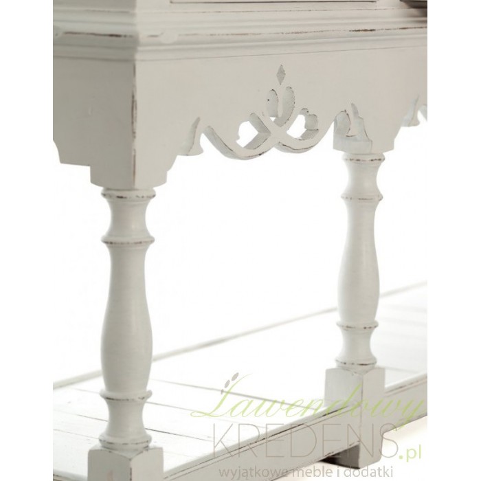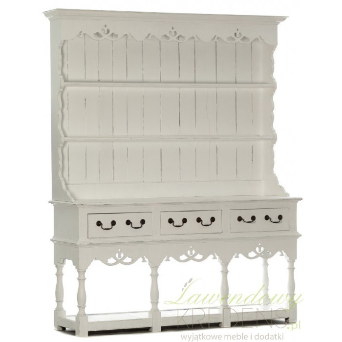 Wyjątkowy kredens z kolekcji Aluro Mazine to niebywałe arcydzieło sztuki użytkowej, nasycone prowansalskim klimatem i nutą elegancji, przez co mebel jest również cudowną ozdobą wnętrza. Dwie otwarte półki pozwolą na wyeksponowanie cennej ceramiki lub ulubionej dekoracji. Poza tym kredens prowansalski posiada trzy szuflady, a każda z nich wyposażona została w dwa klasyczne uchwyty, dzięki którym łatwo je wysuniesz. Pod szufladami znajduje się dodatkowa przestrzeń użytkowa w postaci półki, którą również możesz zagospodarować. Meble prowansalskie Aluro od lat zaskakują naszych klientów połączeniem piękna z funkcjonalnością.