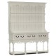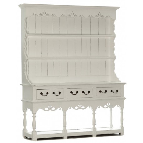 Wyjątkowy, duży kredens Aluro Mazine w stylu prowansalskim z dwiema otwartymi półkami i trzema szufladami z klasycznymi czarnymi uchwytami.