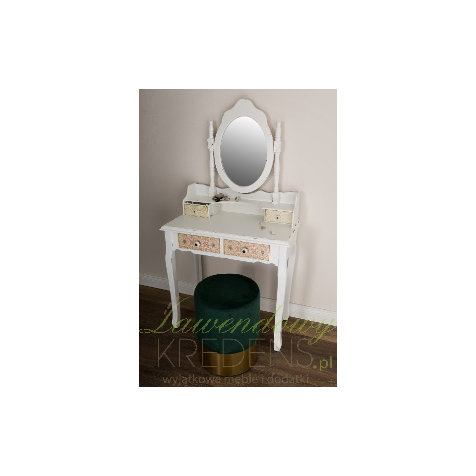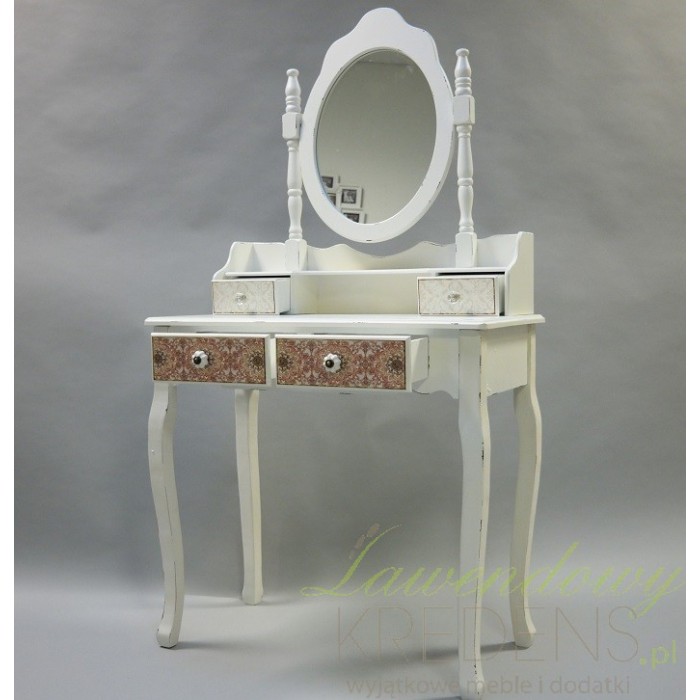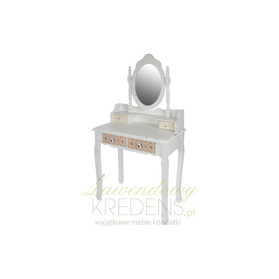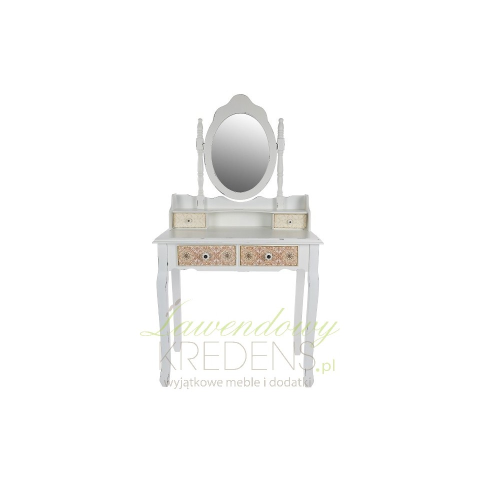Postarzana, biała toaletka prowansalska ma praktyczne lusterko i dekoracyjne szufladki w kolorowe wzorki.