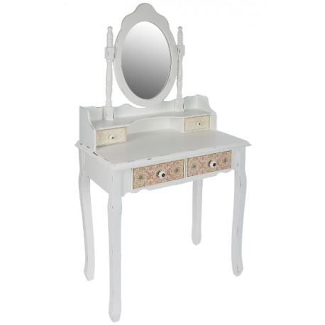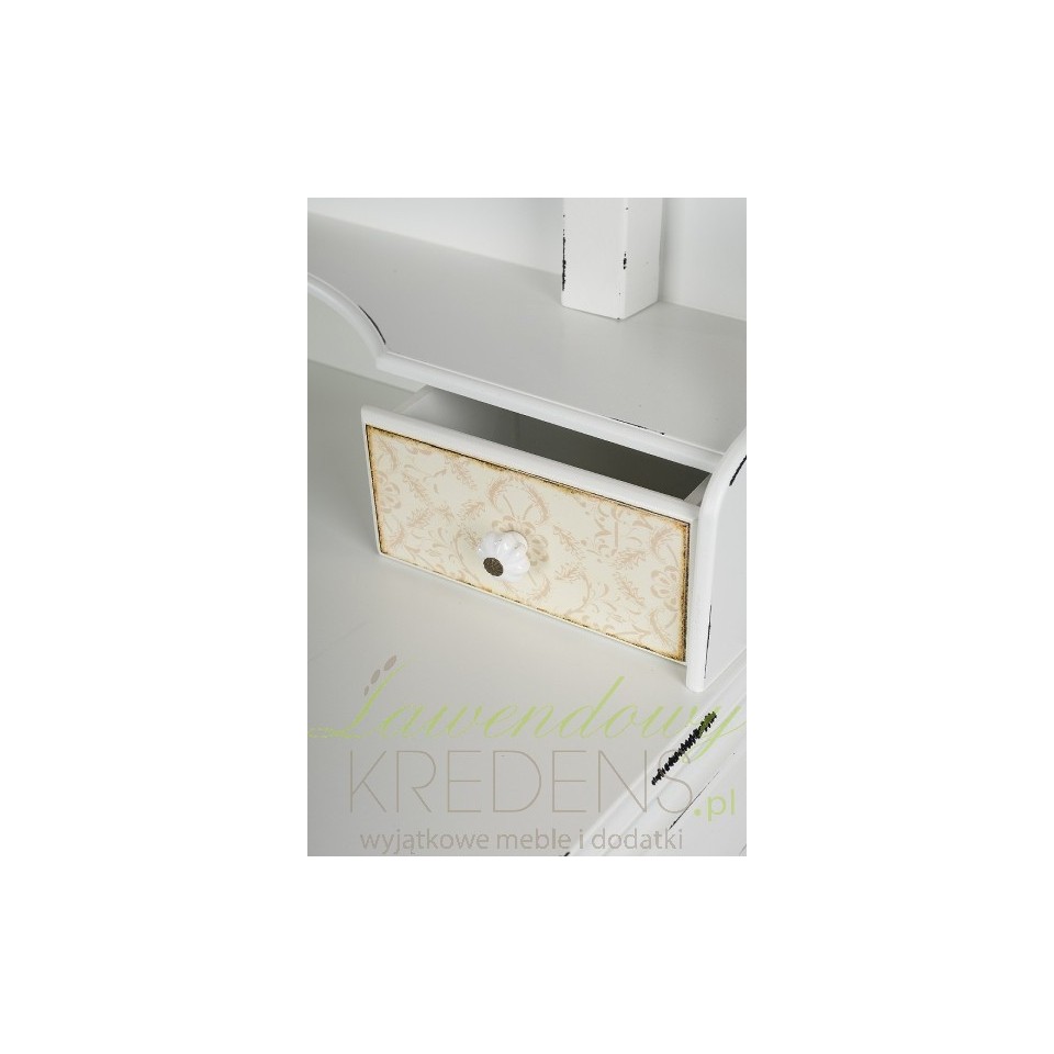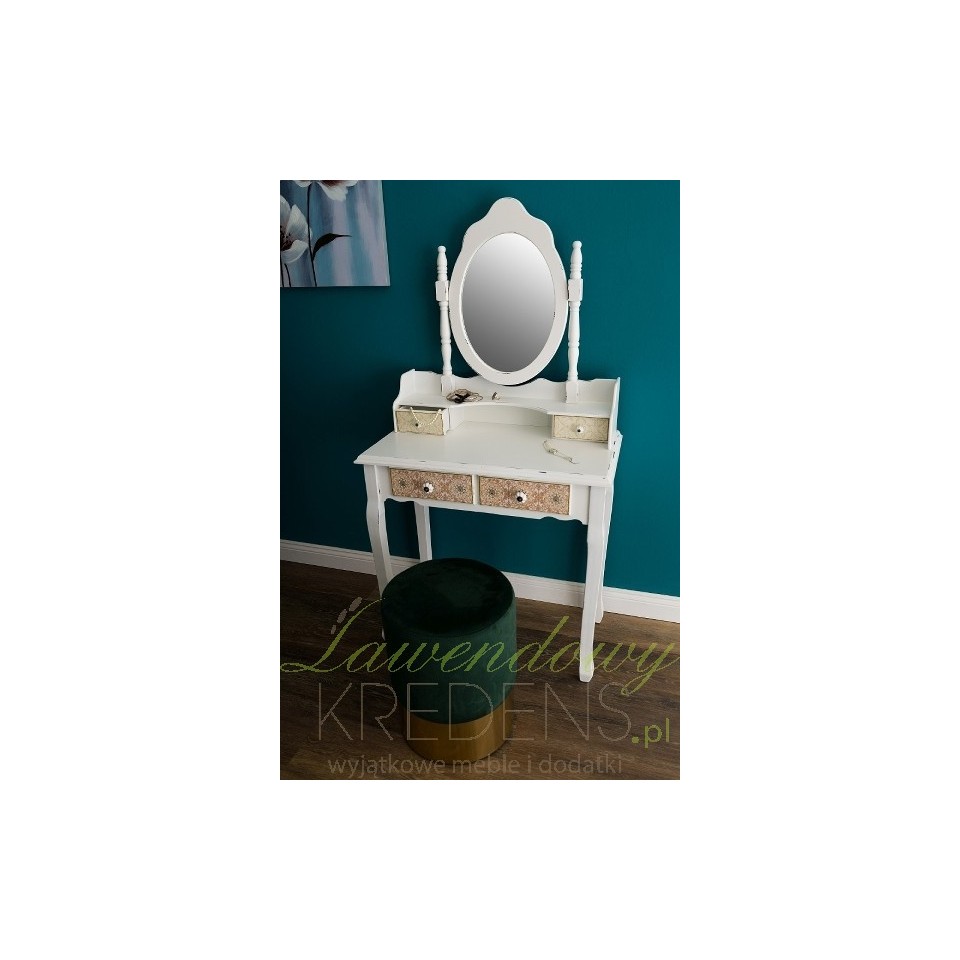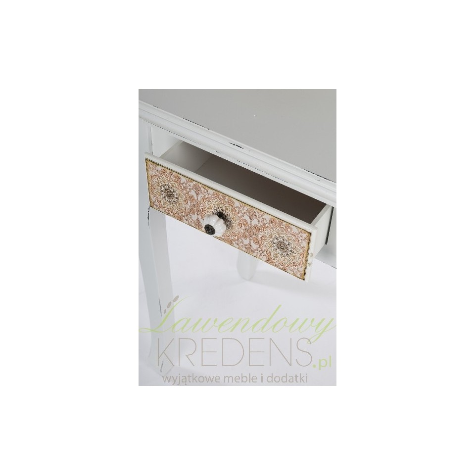 Postarzana, biała toaletka prowansalska ma praktyczne lusterko i dekoracyjne szufladki w kolorowe wzorki.