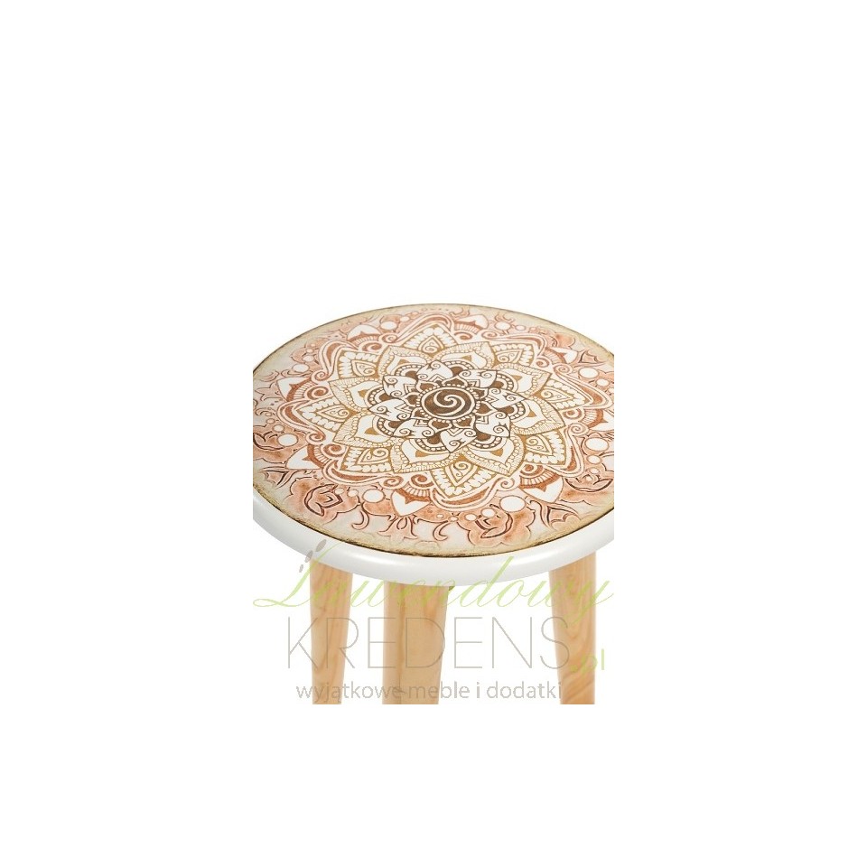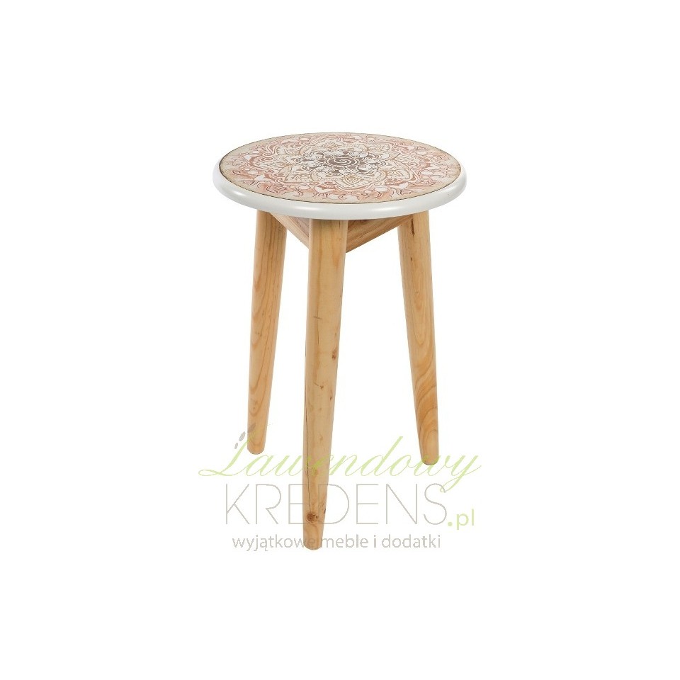 Stołek prowansalski ma trzy proste, lekko odchylone na bok nogi w kolorze brązowym. Wykonany z drewna paulownia został udekorowany okragłym siedziskiem z kolorowym wzorem. Jego niepowtarzalność wynika z prostoty kształtu i efektownych zdobień jakie zaprezentowano na bialym siedzisku. Meble prowansalskie od niemieckiego producenta spodobają się każdemu, kto marzy o oryginalnie zaarażnowanym wnętrzu.