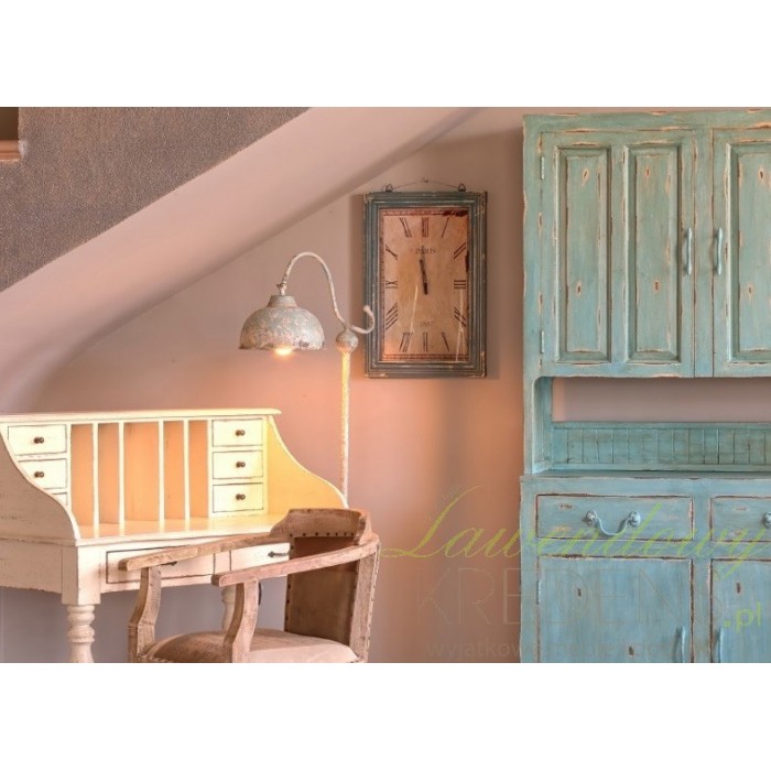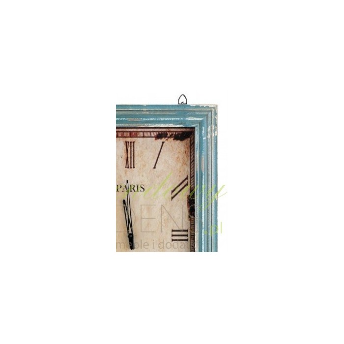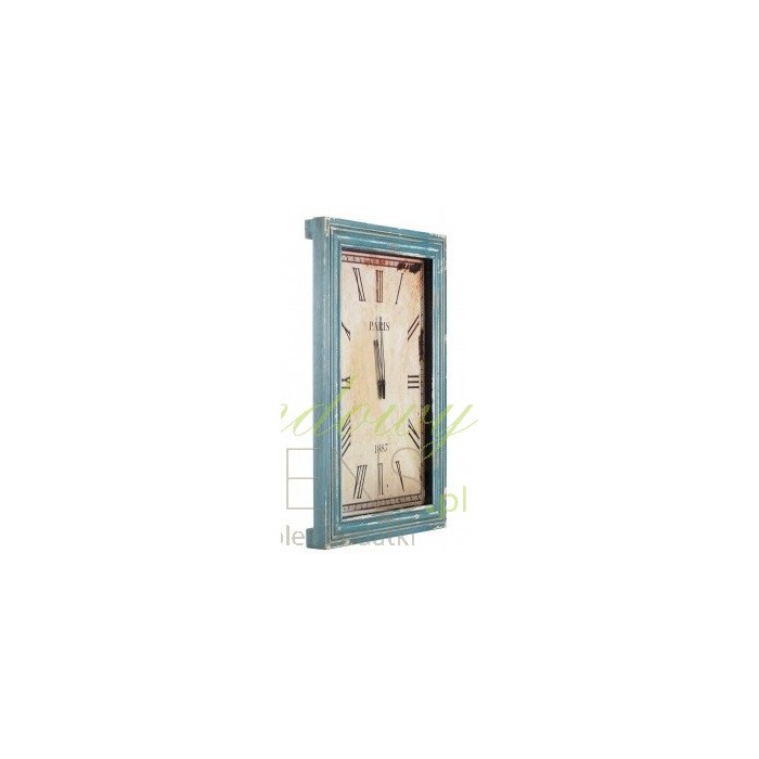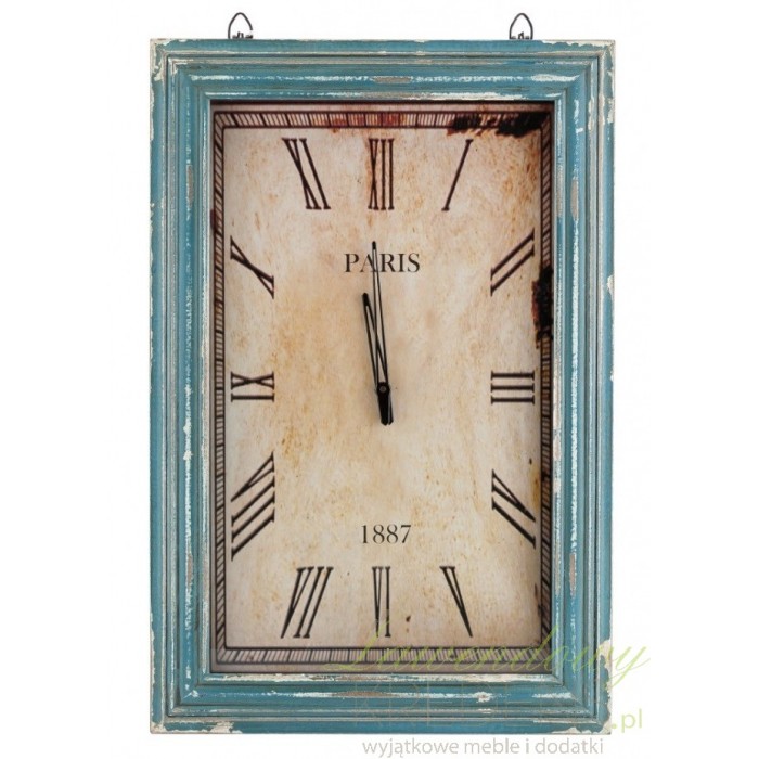 Prostokątny zegar prowansalski w turkusowyym kolorze, wykonany zdrewna mango o wymiarach 60x40 centymetrów. Na jasnym tle widnieje czarny napis Paris 1887. Godziny są określone cyframi rzymskimi i wskazywane czarnymi wskazówkami. Zegar prowansalski został ciekawie postarzony poprzez liczne przetarcia. Zegar Aluro urozmaici każde wnętrze.
