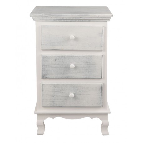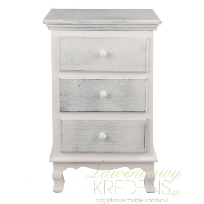 Niewielka szafka prowansalska o wysokości nieco ponad 60 centymetrów z trzema szufladkami. Każda z szufladek została pomalowana szarą farbą i poprzecierana aby mogła z dumą stanąć obok innych mebli prowansalskich lub francuskich. Również dlatego nogi szafki i cokół u dołu zostały wzbogacone o delikatne krągłości. Meble prowansalskie takie jak szafka nocna nie tylko robią spektakularne wrażenie ale również zaskakują możliwościami praktycznego wykorzystania.