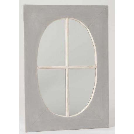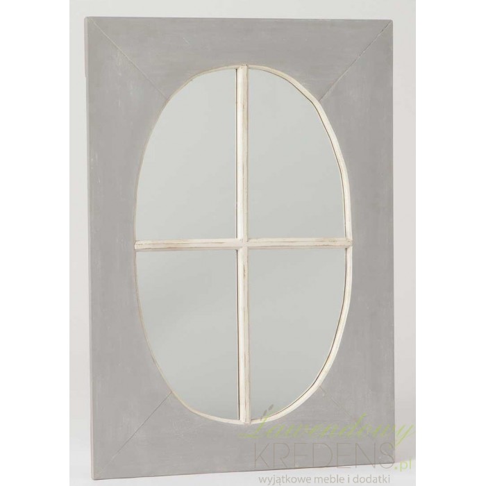 Lustro w stylu prowansalskim wykonane jest z dobrej jakości drewna, płyty MDF i lustra. Lustro okno ma szarą ramkę i białe elementy. W prostokątnej ramie znajduje się owalne lustro przedzielone na cztery równomierne części. Lustro ma wyjątkowy design i b Edzie stanowił niepowtarzalną dekoracje domu.