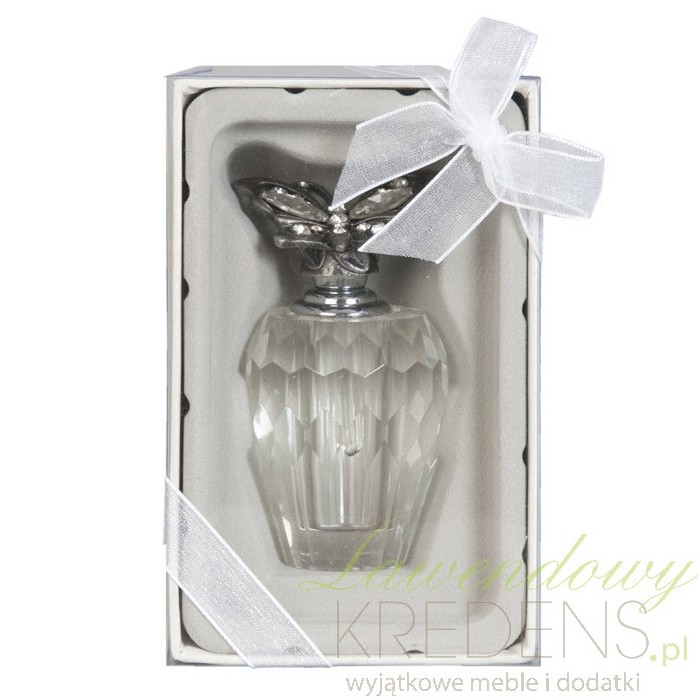 Flakonik na perfumy wykonano z ozdobnego szkła i metalu. Metalowa zakrętka ma kształt motyla i zachwycające detale w postaci małych diamencików. Ta buteleczka na perfumy to proejkt marki Clayre&Eef, która zafascynowana francuskim designem twrzy dodatki dla każdego, kto lubi otaczać się pięknymi przedmiotami. Ozdobny flakonik to jeden z najlepszych pomysłów na prezent dla kobiety.