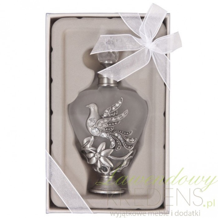 Piękny flakonik na perfumy wykonany ze szkła w mlecznym kolorze. Ta buteleczka na perfumy ozdobiona została metalowym akcentem ptaszka z kwiatkiem na którym widoczne są świetliste cyrkonie.