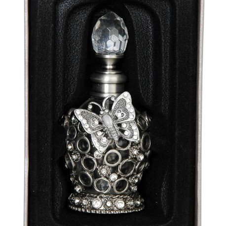 Flakonik na perfumy wykonany został ze szkła i pięknie ozdobiony metalową dekoracją z motylkiem i diamencikami. Przykrywka zwraca na siebie uwagę gustowną, szklaną gałeczką. Buteleczka na perfumy jest wielokrotnego użytku, dlatego jak tylko wykorzystasz swój zapach, będziesz mógł go w bardzo prosty sposób uzupełnić. W ofercie posiadamy także inne buteleczki ozdobione równie ciekawymi wzorami.