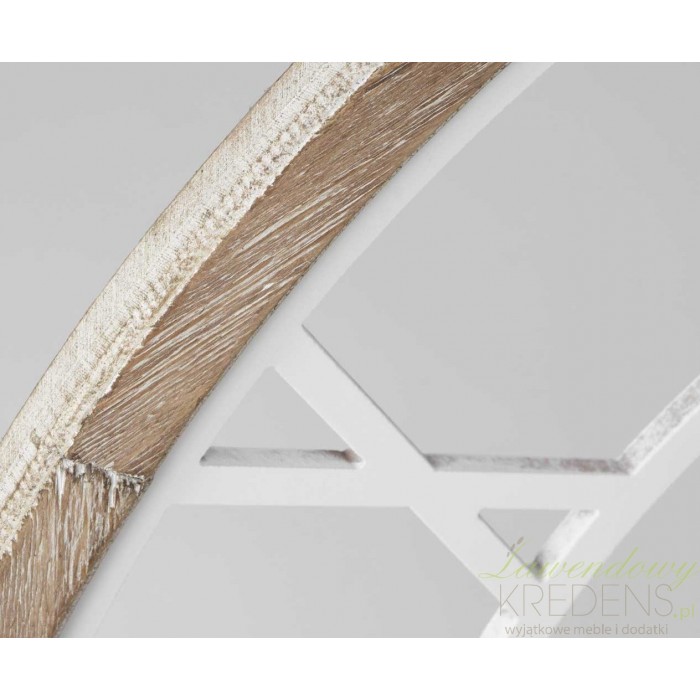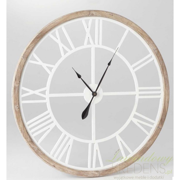 Okrągły, ażurowy zegar ścienny w drewnianej ramie o średnicy 93 cm. Zewnętrzna rama zegara została delikatnie pobielona, nawiązując tym samym do stylu retro. Dzięki czarnym wskazówkom nigdy nie będziesz miał problemu z odczytaniem godziny, a ażurowe wykonanie sprawi, że zegar doskonale dopasuje sie do Twojej ściany. Zegary ścienne w dużych rozmiarach to piękny i widoczny akcent.