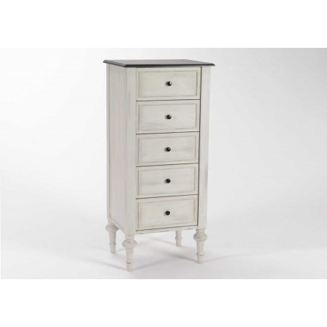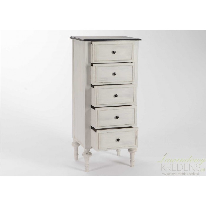 Wspaniała komoda w stylu prowansalskim to funkcjonalny mebel wyposażony w pięć szuflad i ozdobiony celowymi przetarciami.