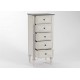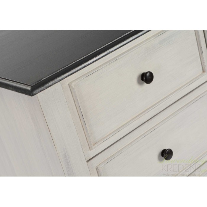 Pięknie prezentująca się komoda Lindi cudownie oddaje klimat jaki wprowadzają do wnętrz meble przecierane w stylu prowansalskim. Elegancki, ciemnoszary blat został zestawiony z antyczną bielą komody. Komoda prowansalska spełni nie tylko funkcję dekoracyjną ale również praktyczną, dzięki pięciu szufladom zaoferuje dodatkową przestrzeń do wykorzystania. Komoda przecierana Lindi to wyjątkowy mebel do stylowych pomieszczeń.