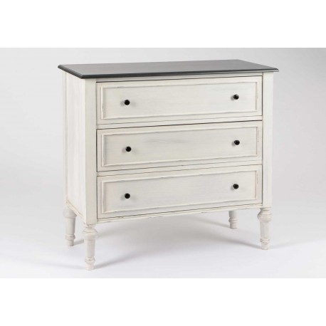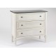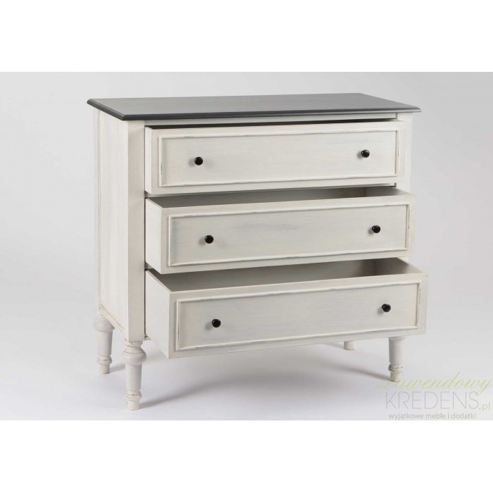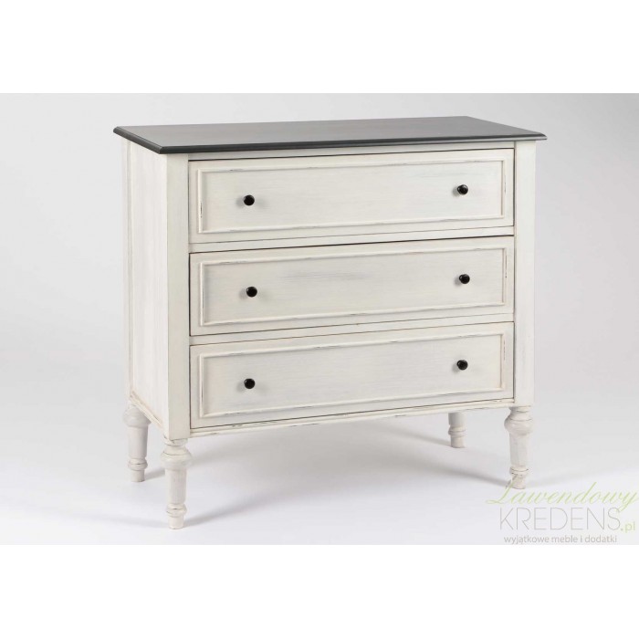 Wspaniała komoda z kolekcji Lindi została zainspirowana stylem francuskich salonów. Wykonana została w eleganckim odcieniu antycznej bieli i połączona z ciemnoszarym blatem. Komoda w stylu prowansalskim jest celowo poprzecierana, dzieki czemu mebel zyskuje niezwykły urok. Uwagę przykuwają również charakterystycznie zdobione nogi i trzy szuflady z czarnymi gałeczkami. Kolekcja Lindi to wyjątkowe meble przecierane specjalnie dla Ciebie!