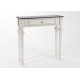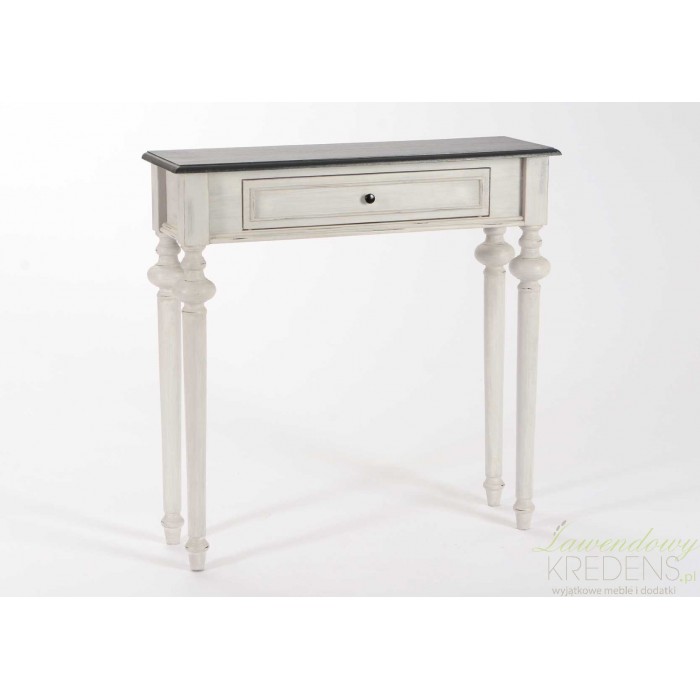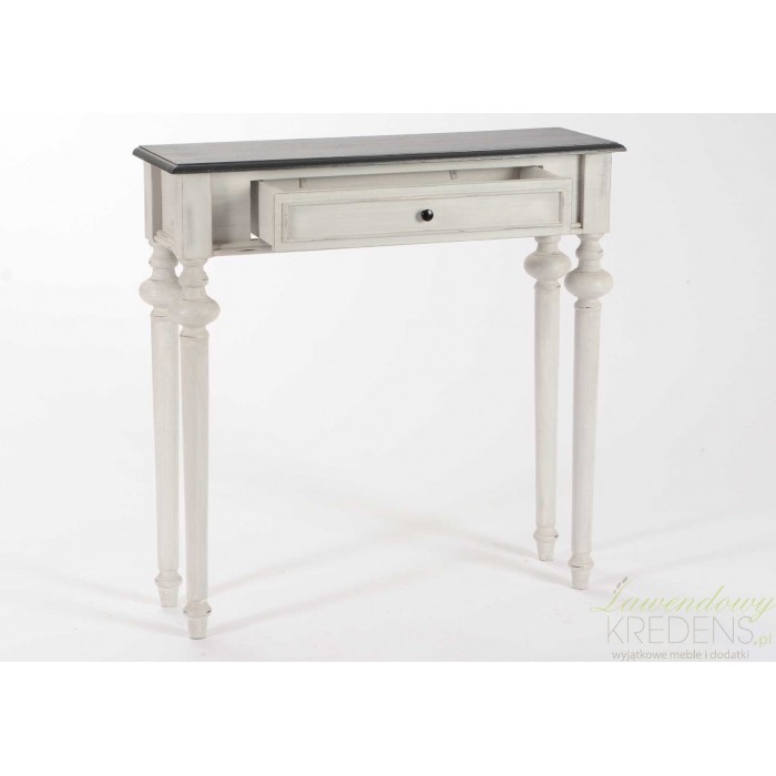 Piękna konsola Lindi w stylu prowansalskim z uroczo rzeźbionymi nogami i praktyczną szufladą oraz ciemnoszarym blatem.