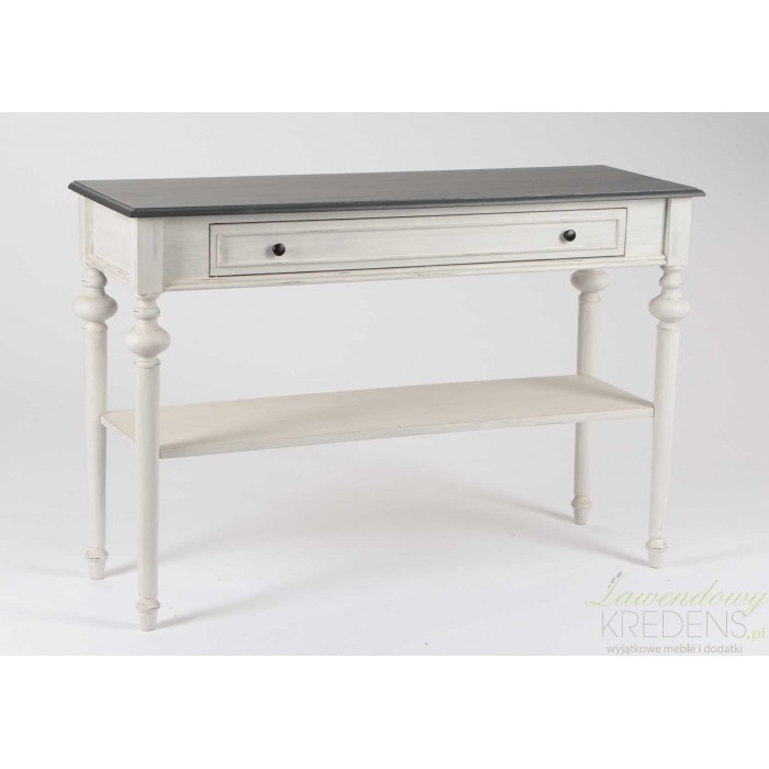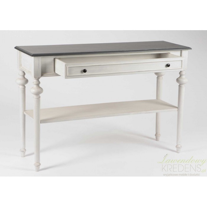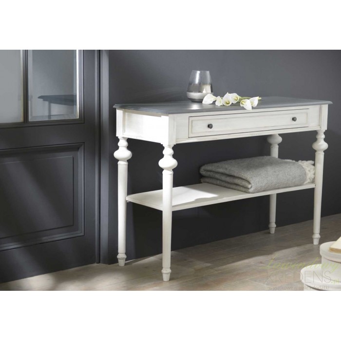 Konsola przecierana z ciemnoszarym blatem oraz jedną otwieraną szufladą, przeniesie nasze otoczenie w rejony Prowansji