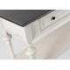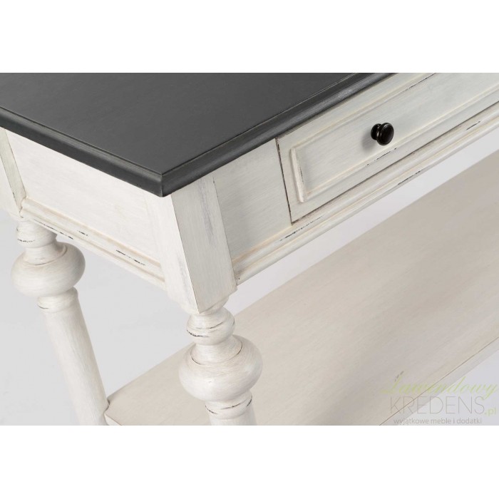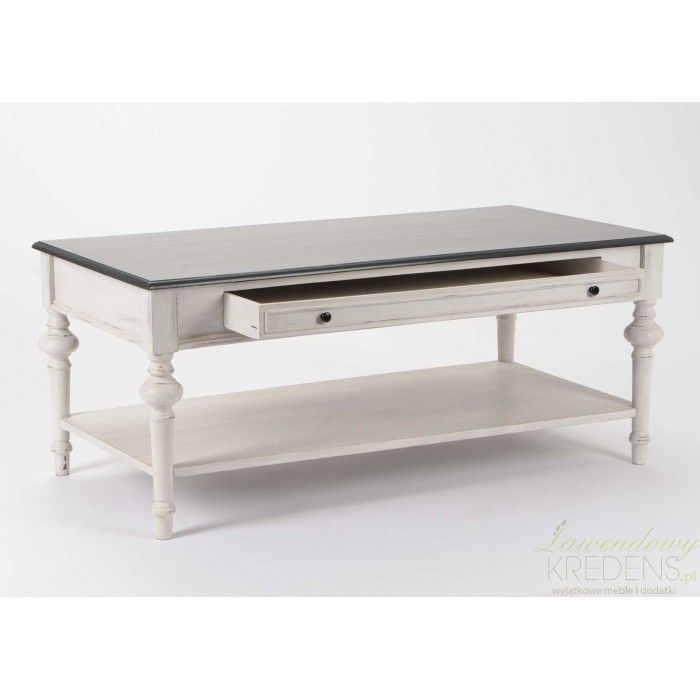 Oryginalny stolik kawowy z kolekcji Lindi, z prostokątnym, ciemnoszarym blatem i dodatkową półką w dolnej części. Stolik posiada szeroką szufladę z gałeczkami po bokach. Nogi stolika kawowego zostały charakterystycznie ozdobione zaokrągleniami. Stoliki kawowe doskonale prezentują się w salonie i nie tylko. W Twoim domu mogą być dodatkowym miejscem na prowansalskie dekoracje.