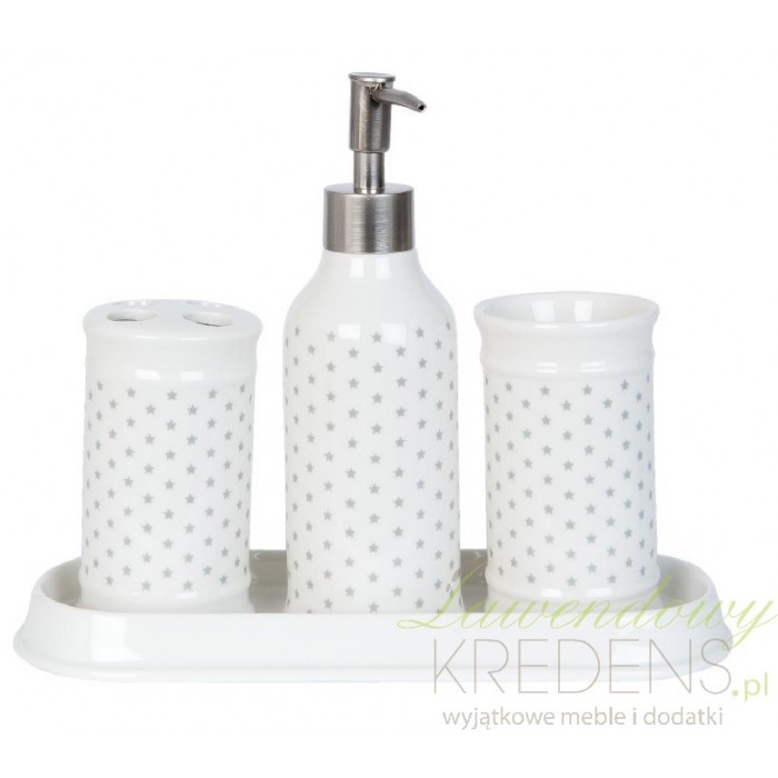 Biały ceramiczny zestaw łazienkowy, ozdobiony szarymi gwiazdkami to idealne rozwiązanie dla każdego. Dodatki do łazienki z naszego sklepu to idealnie połączenie elegancji i funkcjonalności.