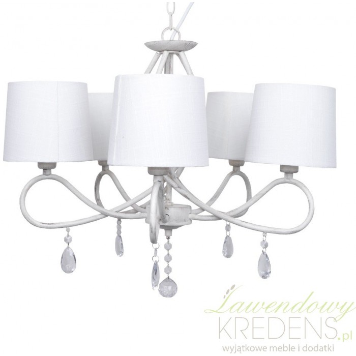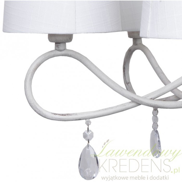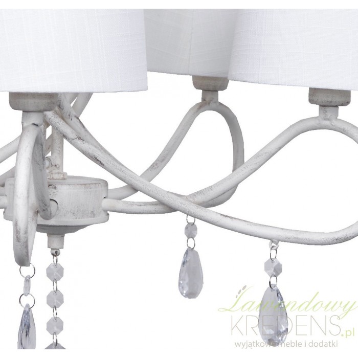 Stylowy żyrandol prowansalski o konstrukcji wykonanej z metalu, pomalowany na biały kolor i celowo postarzony przetarciami. Klasycznej formie żyrandola eleganckiego charakteru dodają zwisające kryształki w kształcie migdałów. Poza kryształkami żyrandol ozdabiają białe abażury. Żyrandole w stylu prowansalskim to niezwykle efektowne dodatki, które fantastycznie ozdobią Twój dom.