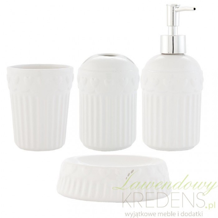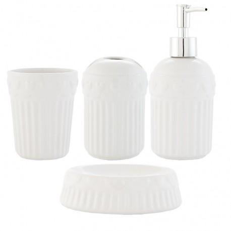 Ceramiczny zestaw łazienkowy to komplet czterech, białych pojemników. Każdy z nich ma wzór w pionowe paski. Zestaw składa się z z dozownika ze srebrną końcowką oraz dwóch kubków i jednej podstawki na mydło w kostce. Dodatki do łazienki, które są jednokolorowe i prezentują się skromnie możesz z powodzeniem dołączyć do łazienek w wielu stylach.