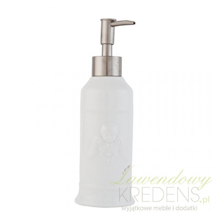 Ceramiczny dozownik do mydła mający ozdobny kształt aniołka. Prowansalskie dodatki do łazienki to wiele różnych produktów, które używamy na codzień. Pojemnik na mydło w białym kolorze i srebrną pompką, będzie świetną dekoracją.