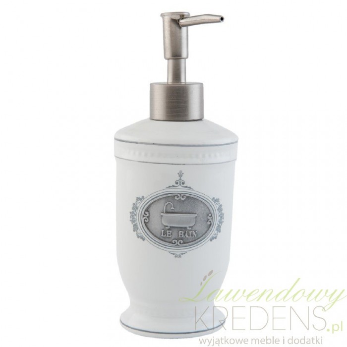 Biały dozownik do mydła wykonany z ceramiki ozdobiony metalową tabliczką to produkt, który przykuję uwagę każdego.