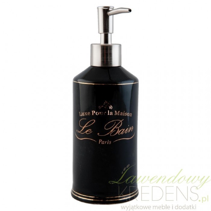 Czarny, francuski dozownik do mydła ozdobiony pozłacanymi napisami Le Bain Paris. Utrzymany w francuskim stylu dozownik ma klasyczny i elegancki charakter.