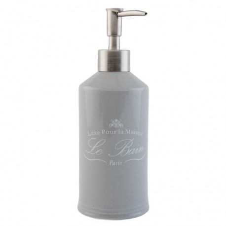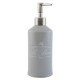 Piękny dozownik do mydła w szarym kolorze z białymi, francuskimi napisami i pompką w srebrnym kolorze.