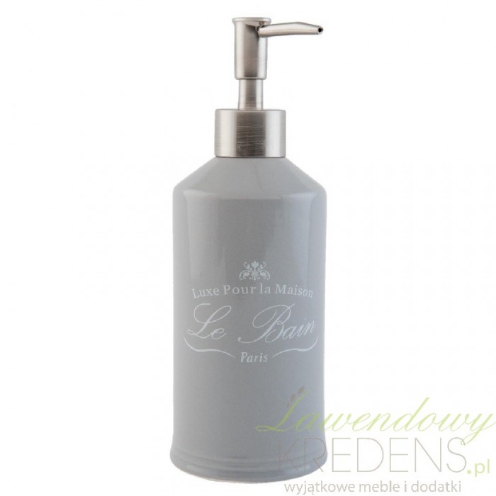 Elegancki dozownik do mydła został wykonany z ceramiki i utrzymany jest w szarej kolorystyce. Pojemnik ozdobiono białymi napisami w języku francuskim, które podkreślają jego pałacowy charakter. Oryginalny dozownik z srebrną pompką będzie idealnie pasował do każdej aranżacji. Pozwól sobie na odrobinę luksusu już teraz!