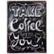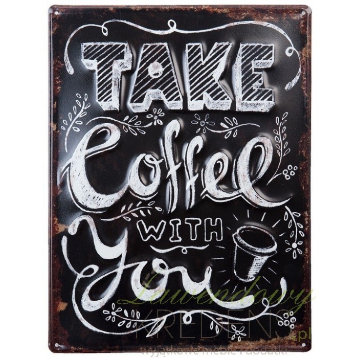 Obraz metalowy w ciemnym kolorze ozdobiony białymi napisami, które mają ciekawą czcionkę. Obraz z kawą to niezwykle modny dodatek, który może znaleźć się w każdej kuchni czy też jadalni, a także interesująco wpasuje się do wnetrza restauracji. Obrazy metalowe to świetna alternatywa dla obrazów wykonanych na płótnie.