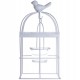 Piekny, szklany świecznik w klatce w białym kolorze został ozdobiony małym ptaszkiem i pomalowany na biało.