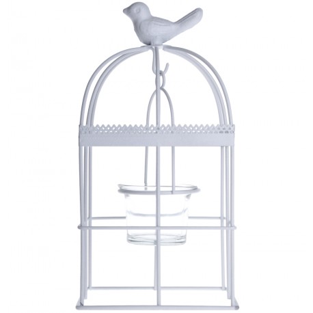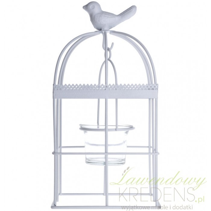 Bardzo interesujący świecznik w formie klatki z uroczym ptaszkiem na górze. Wewnątrz klatki, na haczyku jest zawieszony szklany pojemnik na świeczki. Ta fantastyczna dekoracja prowansalska wykonana została z metalu w białym kolorze, przez co wygląda niezwykle lekko i poza tym, że jest świecznikiem, jest również piękną ozdobą. Nie zastanawiaj się dłużej, niech świecznik w klatce odmieni Twoje wnętrze!