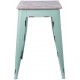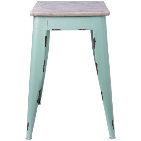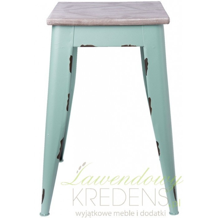 Stołek metalowy na czterech nogach w miętowym kolorze został wyraźnie postarzony. Na krawędziach nóżek są widoczne efektowne odpryski farby i zadrapania. Charakterystycznym elementem miętowego stołka jest kwadratowe siedzisko w naturalnym, jasnym kolorze drewna. Ten ciekawie prezentujący się mebel przeniesie każdego użytkownika i obserwatora w dawne, klimatyczne czasy.