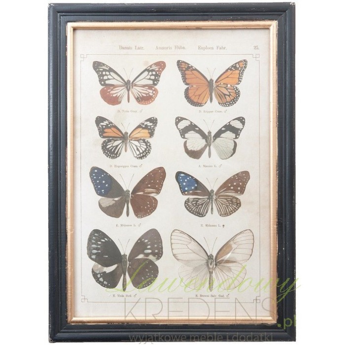 Oryginalny obraz z motylami został oprawiony w postarzaną ramkę w dwóch kolorach. Drewniana rama nadaje obrazowi retro naturalności oraz szyku. Powabne motyle rozmieszczone równo w dwóch rzędach są podpisane nazwą gatunku. Wybierz obrazy z motylami takie jak obraz w stylu prowansalskim do gabinetu lub do sklepu ze zwierzakami.