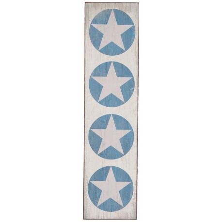 Drewniany obraz retro o podłużnym kształcie prostokata mający białe tło, a na nim trzy niebieskie kółka z gwiazdkami w środku. Obrazy retro posiadają nie wielkie postarzenia dzięki, którym klimat wnętrza zostanie delikatnie podkreślony.