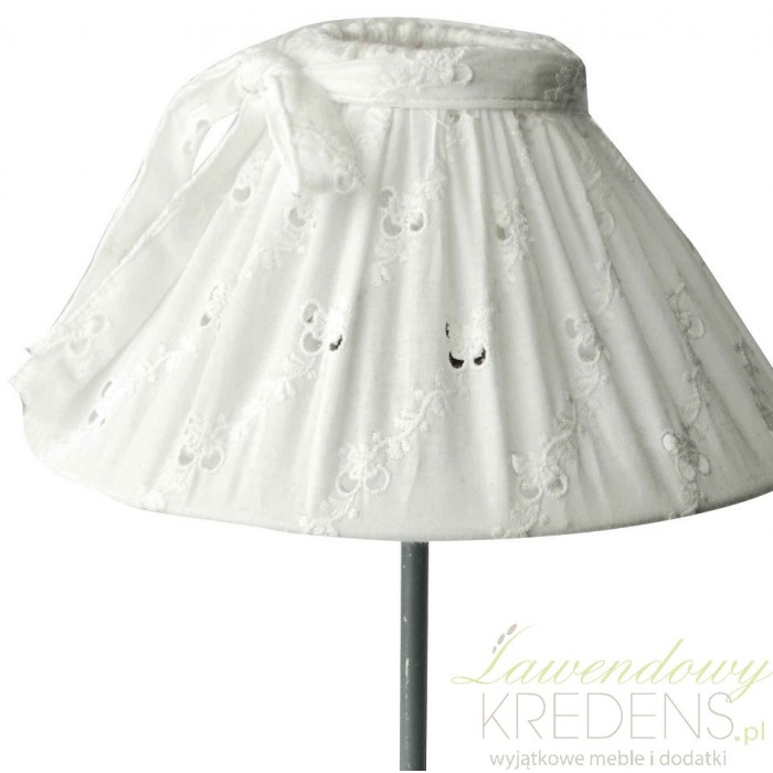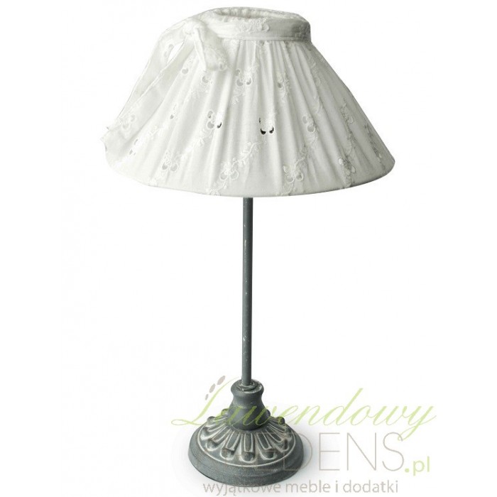 Lampka w stylu prowansalskim to bawełniany abażur z haftem i wstążką ustawiony na cienkiej nóżce z solidną podstawą.
