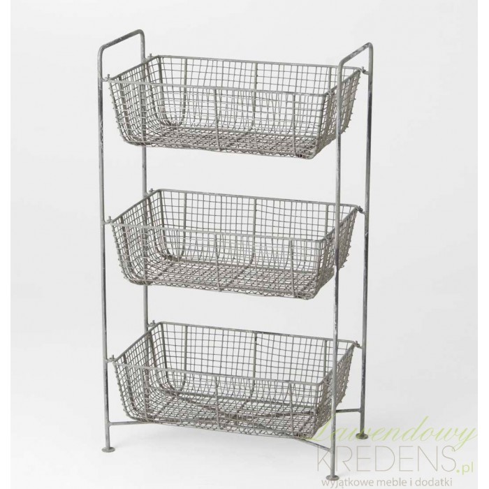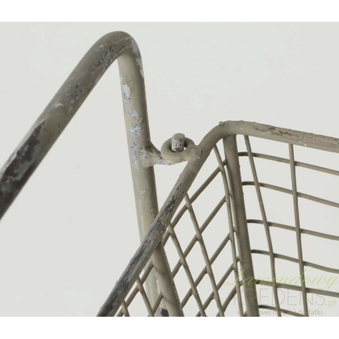 Niezastąpiona wśród praktycznych mebli szafka z trzema koszami wykonana została z metalu. Podparta jest na czterech prostych nózkach, które łączą się u góry i tworzą dwa uchwyty ułatwiające przestawianie mebla. Szafka w szarym kolorze poza tym, że ułatwi Ci przechowywanie rzeczy, które zawsze chcesz mieć pod ręką, będzie wygladała w Twoim domu na szafkę, która służy Ci od wieków. Celowe przetarcia i obdrapania wskazują na jej oryginalny, antyczny design.
