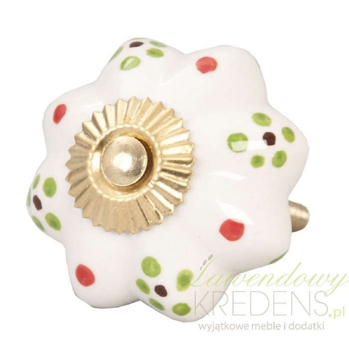 Gałki ozdobne, a w tym gałki meblowe to świetny pomysł na całkowitą odmianę pokoju. Gałka meblowa firmy Clayre & Eef ma biały kolor a naokoło przepiękne różnobarwne kwiatki. Wykonana jest z wysokiej klasy ceramiki o kształcie kwiatka. Zdobi ją przepiękny środek o złotym kolorze.