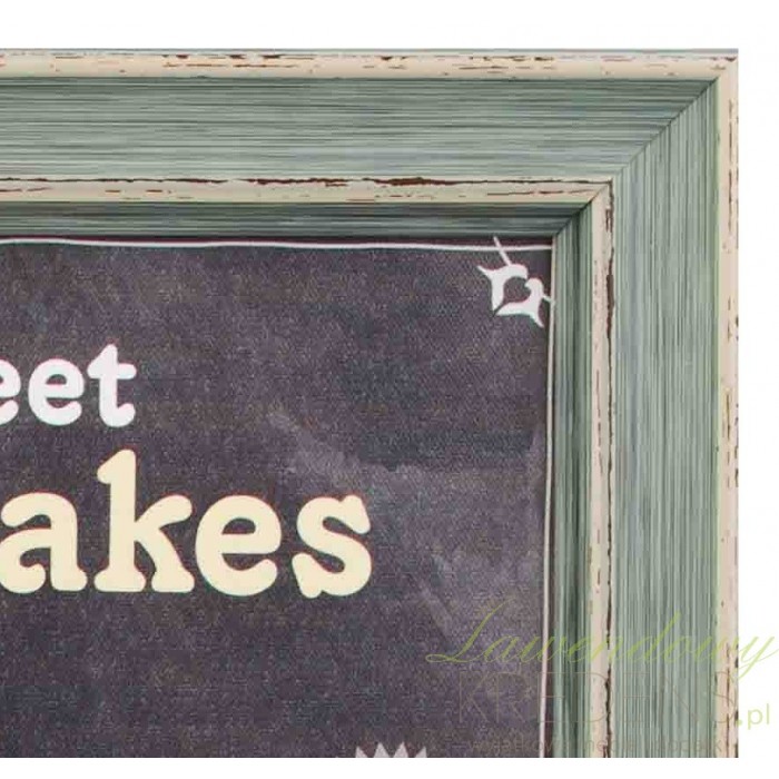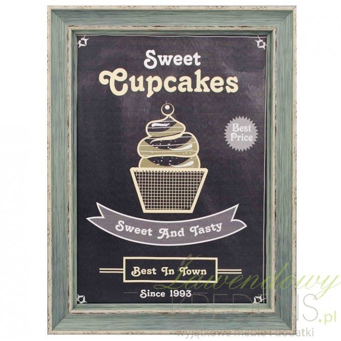 Obraz z babeczką jest prostokątny i oprawiony w mocno postarzaną ramę w kolorze szarozielonym. Na obrazie znajdują się jasne napisy i smakowicie prezentująca się babeczka, wyglądające jakby zostały narysowane kredą na tablicy. Obraz retro z słodkościami jest doskonały do kawiarni lub cukierni. Obrazy w stylu retro wybierz do wnętrz urządzanych z pasją.